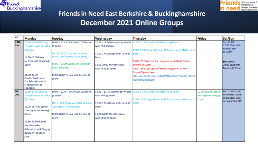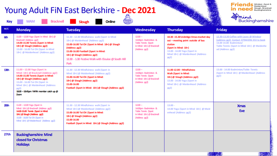Friends In Need Christmas timetable December 2021 (online)